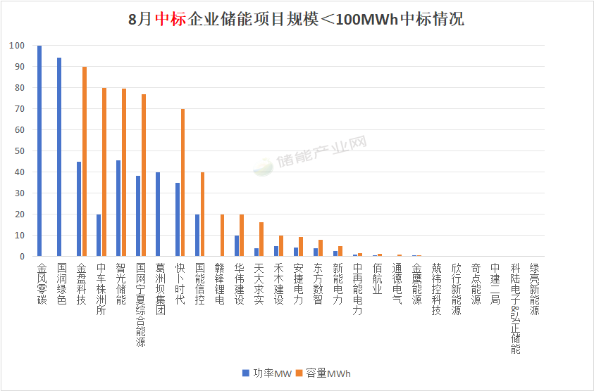值得注意的是,中标规模在100MWh以下的企业中既有EPC企业也有储能系统企业。金风零碳、金盘科技等风电企业也出现在中标名单中。